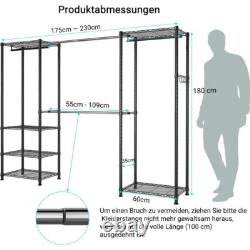This hanger comes with 6 wire shelves, hanging rods and side hooks, all equipped with a secure locking system. You can easily adjust the shelf to create plenty of storage space for clothes, shoes or everyday items. Practical design: The entire length of the coat rack can be.Extended from 175 cm to 230 cm. Making the rack suitable for medium and large rooms. You can measure the dimensions of your room and then extend it to the desired length. Solid construction: The adjustable feet supplied improve the stability of the shelf and ensure that it stands firmly and evenly, even on uneven floors. High quality materials: made from high quality thickened carbon steel and powder coated to protect it from water and rust, for stability and durability.