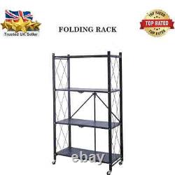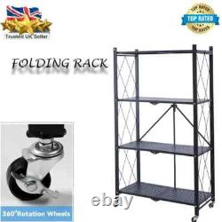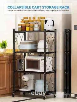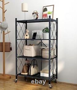 Étagère de stockage en métal à 4 niveaux - Unité de rayonnage pliable avec roues. Assemblez l'ensemble du cadre rapidement et facilement ; aucun outil requis, vous faisant gagner du temps et de l'énergie, garantissant que les étagères sont sécurisées et prêtes à l'emploi. [Capacité de charge élevée] Transitionnant sans effort de mobile à stationnaire. [Mobilité sans effort] Équipée de 4 roues silencieuses pouvant pivoter à 360°, cette étagère roulante simplifie les tâches de déplacement et de nettoyage des sols. [Résistante à la rouille et robuste] Fabriquée en métal électroplaqué, cette unité de rayonnage à 4 niveaux est durable, solide et résistante à la rouille ; ses surfaces sont faciles à nettoyer, garantissant longévité et hygiène.